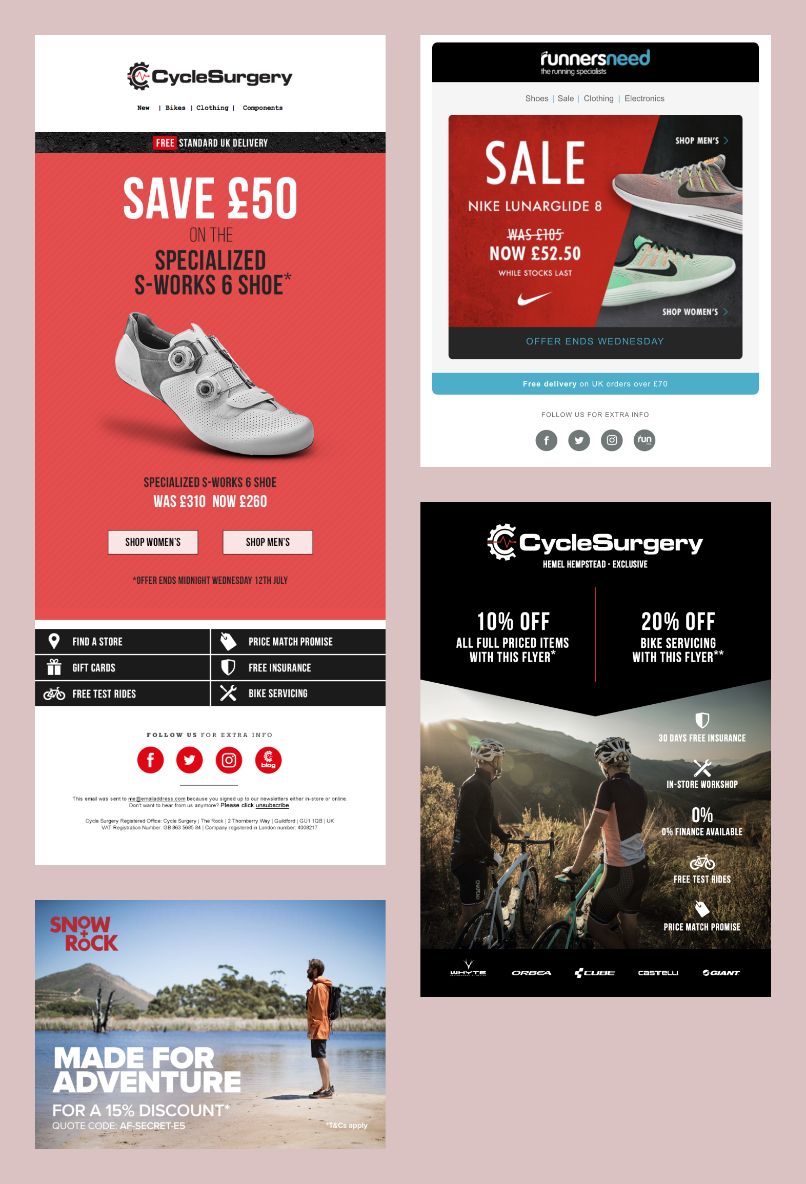 I worked on weekly email campaigns across Snow + Rock, Cycle Surgery, and Runners Need