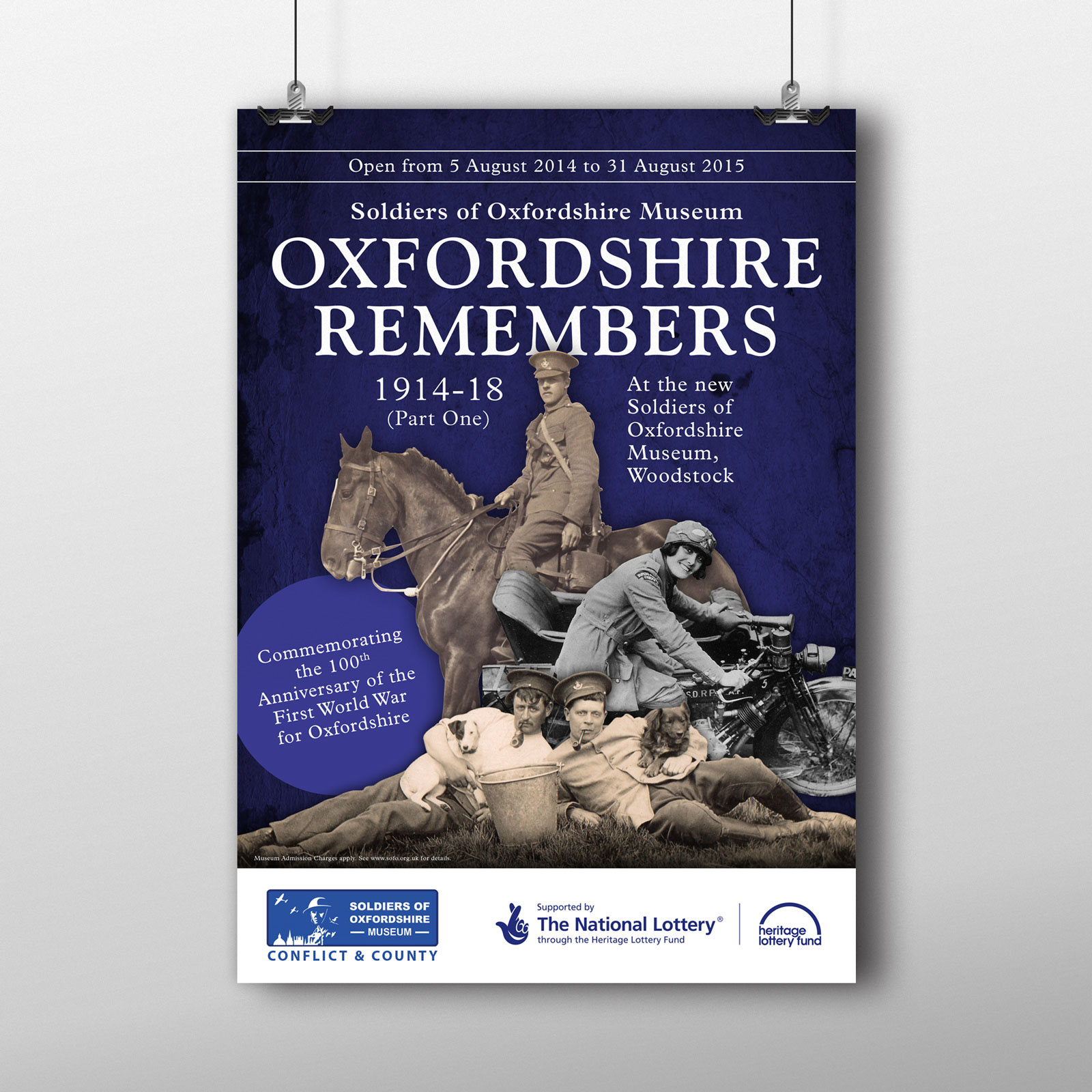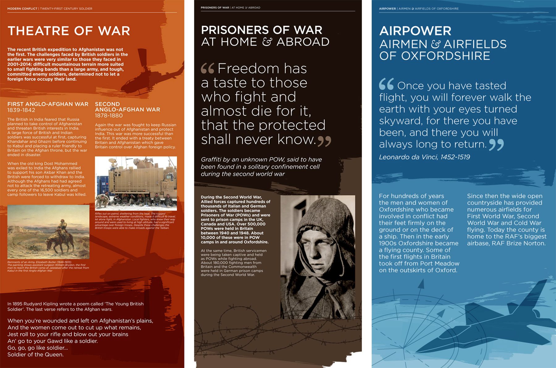 I was tasked with redesigning the look for the newly rebuilt Soldiers of Oxfordshire Museum. This involved creating a design style to work throughout the museum; including interior signage, illustrations for window vinyls and object labelling. This project lasted 18 months, from initial concept through to installation, and involved constant communication with museum directors, museum designers, project managers and printers.